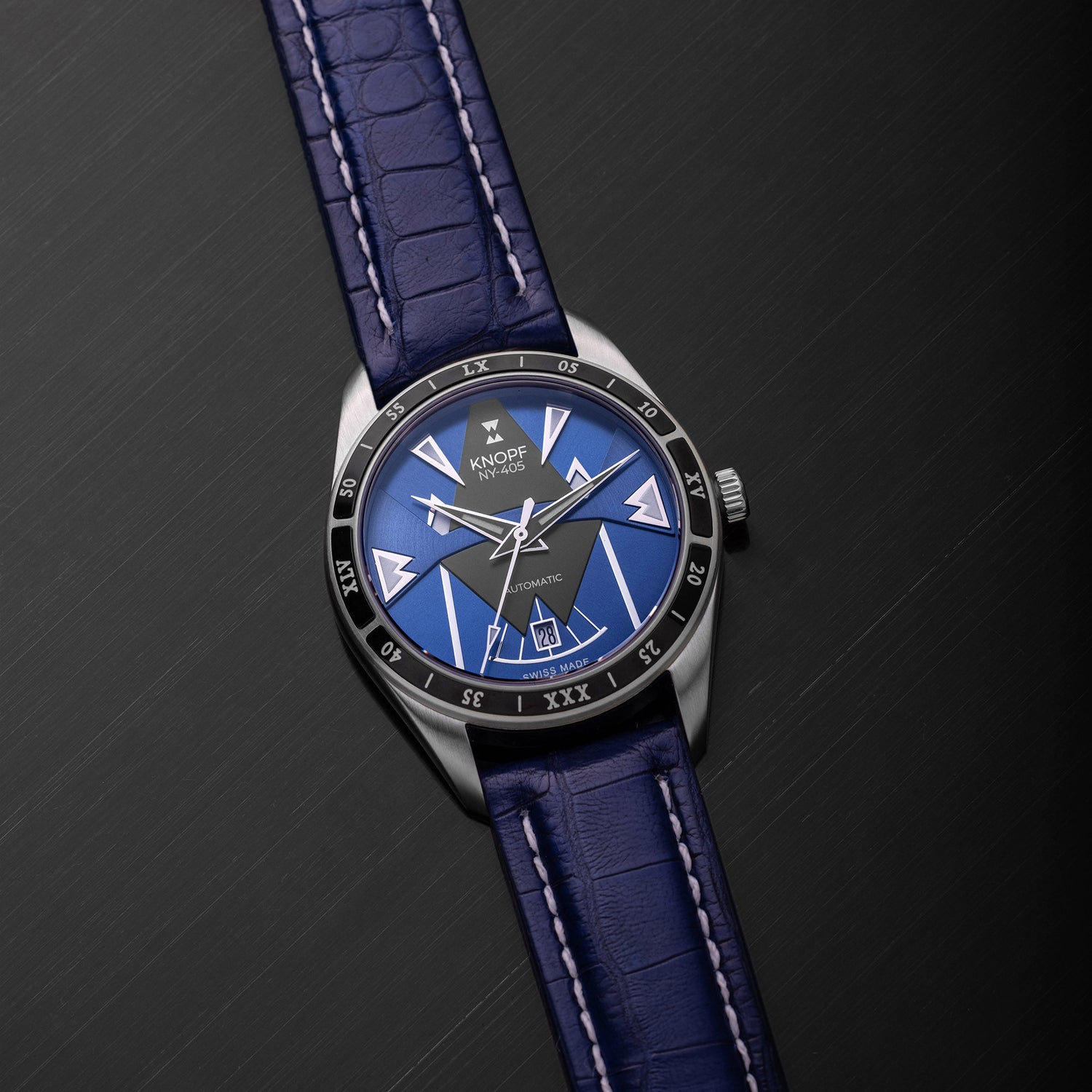 The KNOPF NY-405 features an extruded bezel that is part of a unique, 2-part case/bezel assembly designed exclusively for KNOPF.