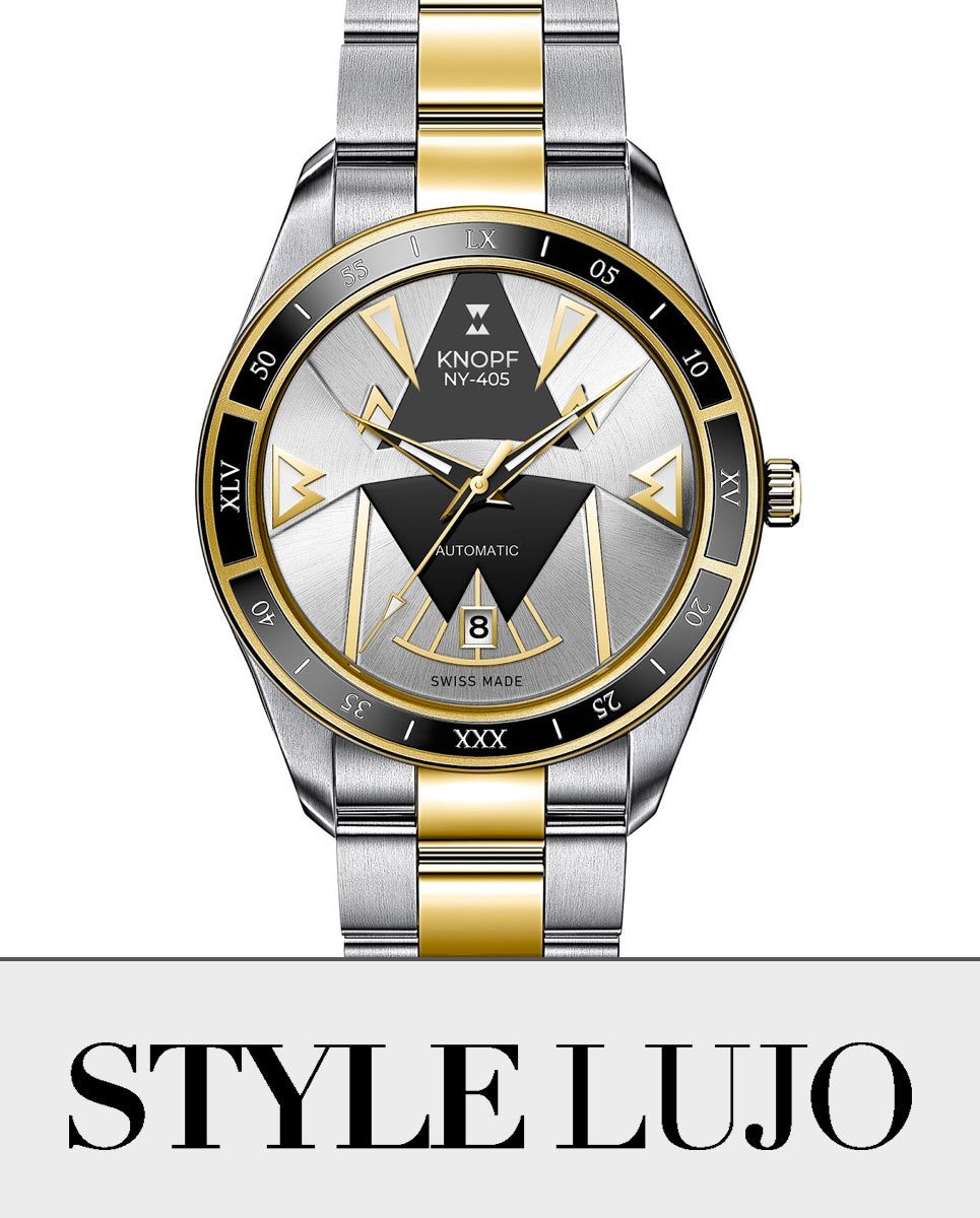 Style Lujo's 'Holiday Gift Guide For Men: THE 12 LUCKIEST WATCHES TO RING IN THE NEW YEAR' recommends the KNOPF NY-405 Gold Steel. -