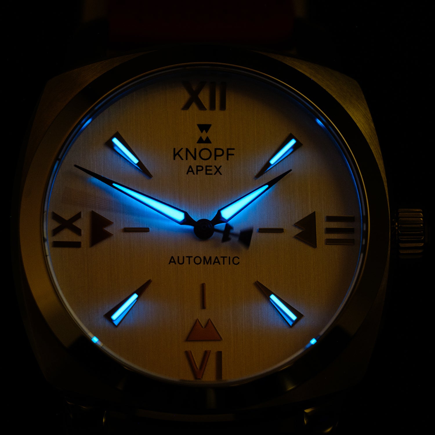 No more struggling in the dark—our Super-LumiNova BGW9® glows with an impressive 95% on the Relative Brightness scale, keeping your dial brilliantly visible when the lights go out. Whether it’s midnight or moonlight, the KNOPF APEX is always ready to shine.