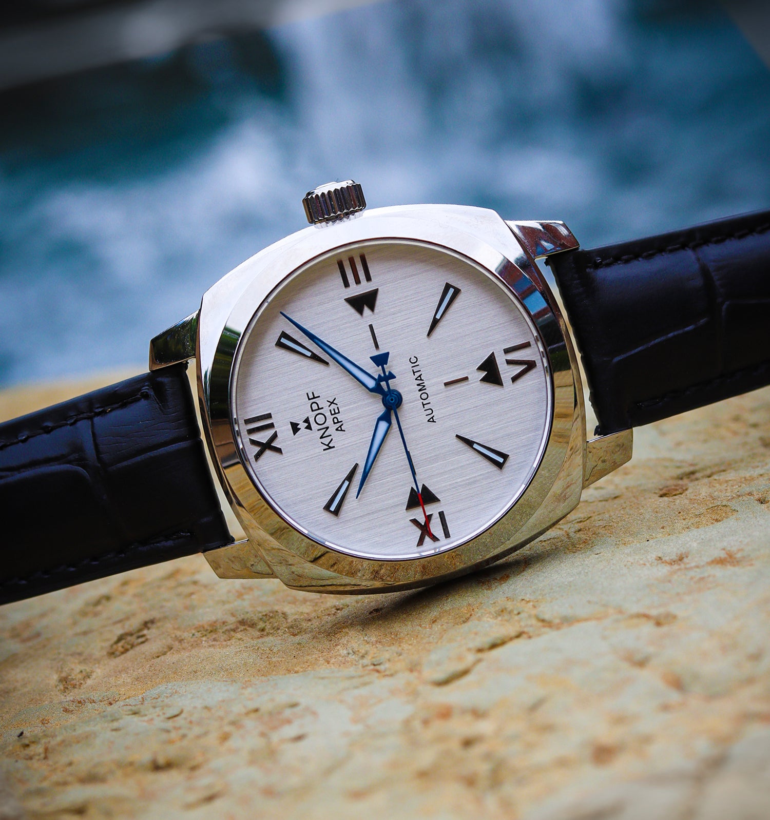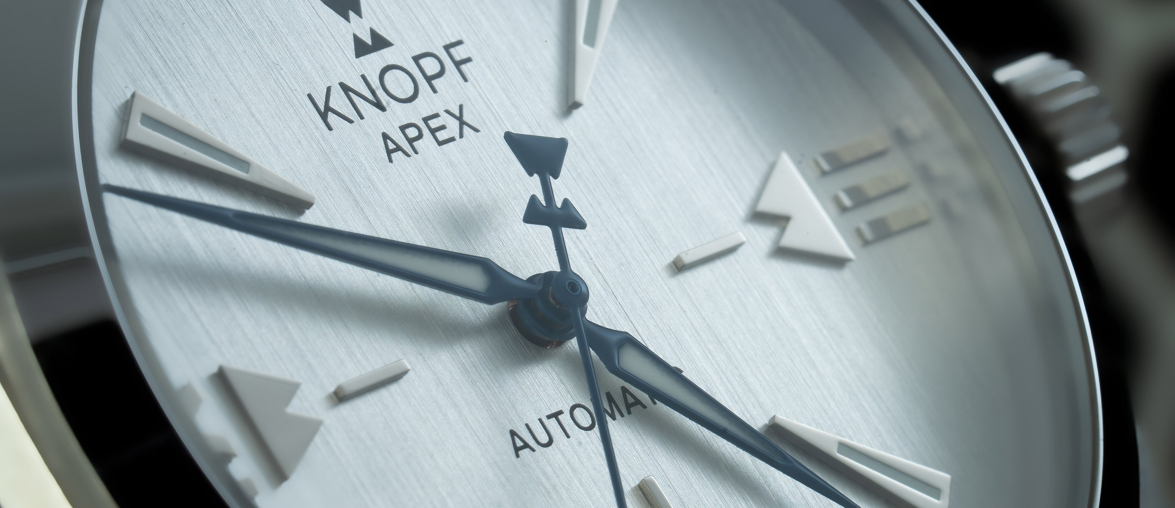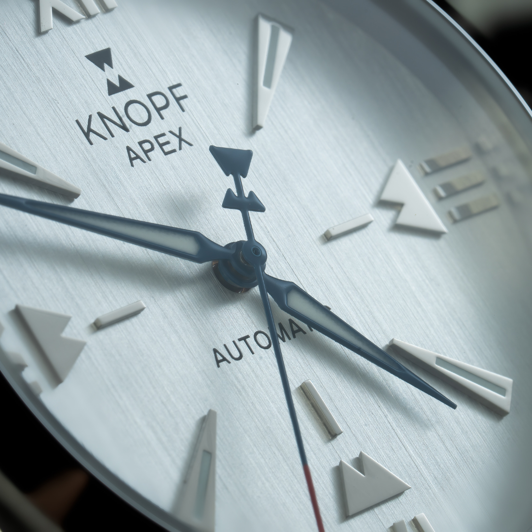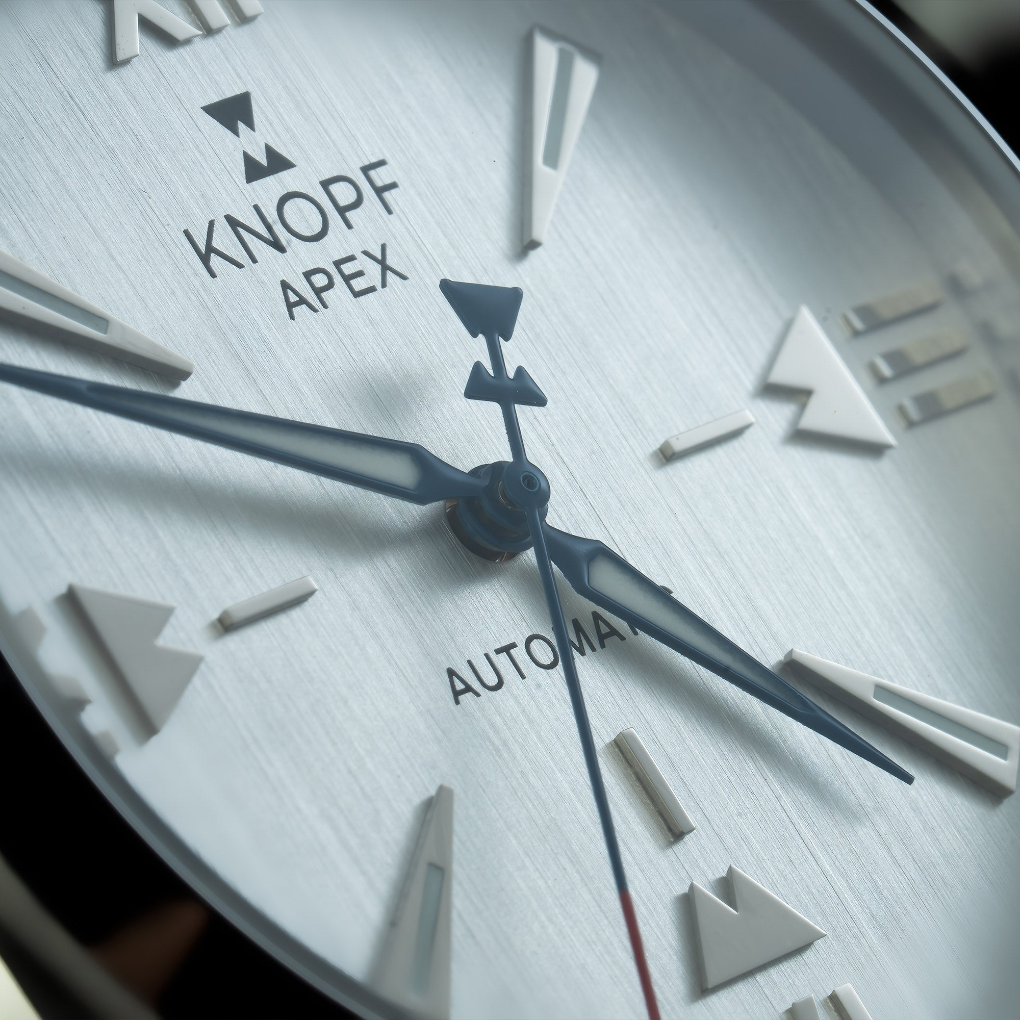 The KNOPF APEX showcases a handcrafted dial that’s unmistakably ours—bold, refined, and built to stand out. Deep vertical brushing and striking geometric forms create a mesmerizing play of light, turning every glance into an experience. Designed to command attention, this is no ordinary watch—it’s a game changer.