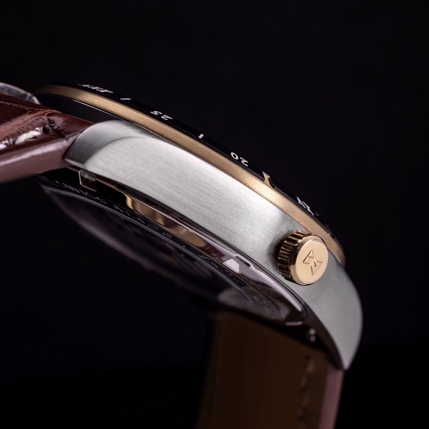 Featuring a one-of-a-kind, 2-part case assembly, our timepiece offers a distinctive profile featuring a .25mm extruded bezel with 4 spacers around the ring.
